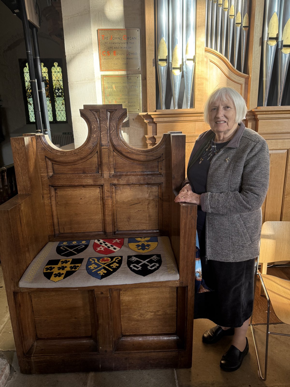 “Canvas and wool were purchased through the Guild of Needlework. The designs for the coats of arms were adapted from patterns used by the Provincial Mothers’ Union to make a banner in the late 1990s. There are 69,300 cross stitches on the cushion which used 108 ten-metre skeins or one kilometre if wool!